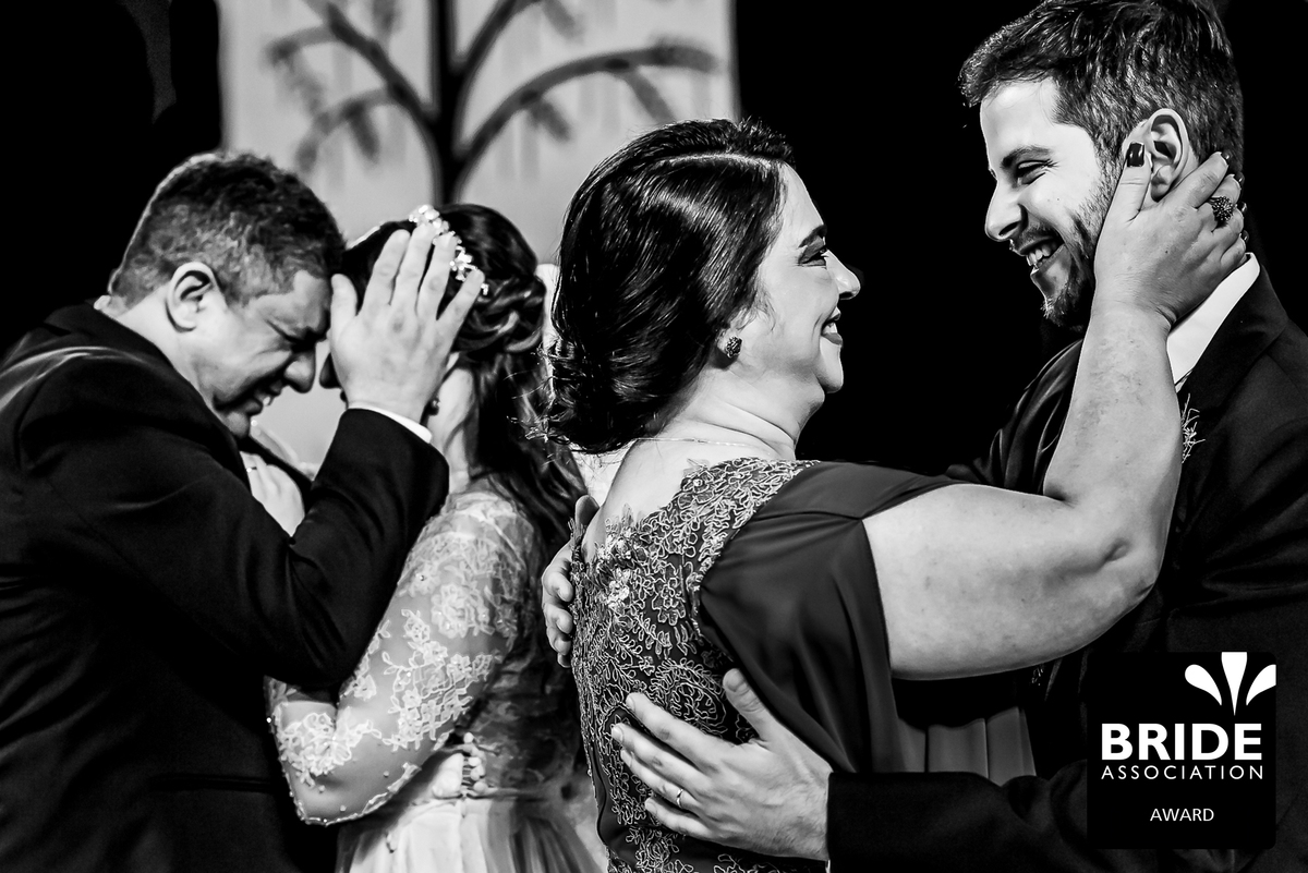 Noivo, sogra e cunhados rindo no altar durante casamento no Santuário Nacional de Aparecida-SP.